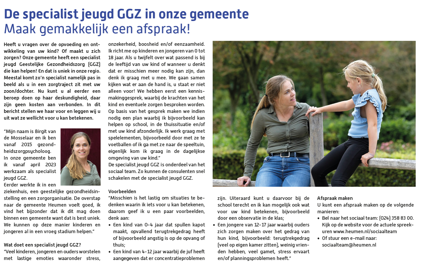 In gemeente Heumen kunnen gezinnen terecht bij een specialist jeugd GGZ die direct onderdeel is van het sociaal team. Dat is bijzonder, want meestal komt een specialist pas in beeld wanneer een zorgtraject al is gestart. Heumen kiest bewust voor een andere aanpak: behandeling in de omgeving van het gezin en laagdrempelig advies.